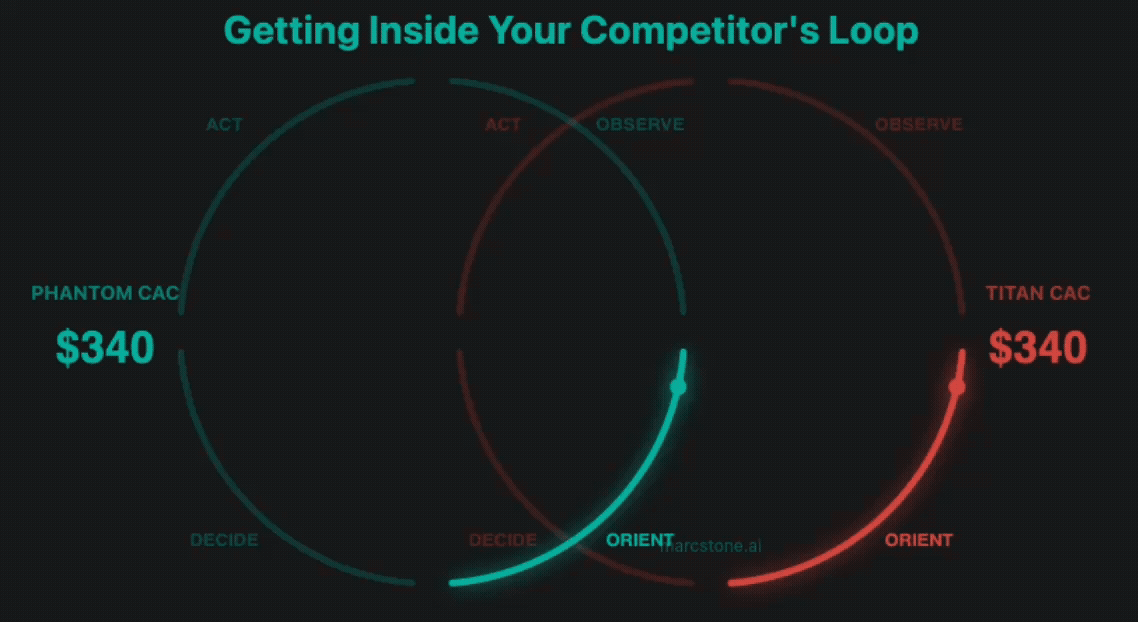 Phantom has a stateful revenue machine. It spotted those keywords six days ago. Tested them. Found the adjacent long-tails, the misspellings, the question variants, the comparison terms that convert at half the cost. Positions Titan cannot see from their tooling. By the time Titan adjusts on Thursday, Phantom has already harvested the cheapest inventory, driven up the auction price on the terms Titan just found, and moved to the next cluster. Titan bids up. Phantom is gone. Titan finds another pocket. Phantom was there first. Every time Titan reacts, the machine has already priced them out and relocated to cheaper ground. Titan is not behind by a few days. They are structurally more expensive on every keyword, every impression, every conversion. Worse, they are blind to it. Their CAC is permanently higher. Titan’s data was accurate. Its decisions were rational. It never saw the gap because Phantom got inside its OODA loop. That gap compounds daily.